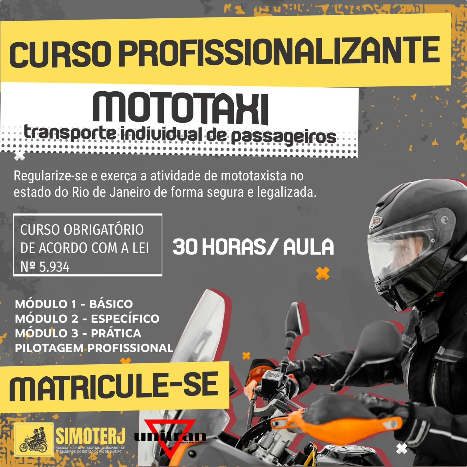 O SIMOTERJ – Sindicato dos Mototaxistas ( Transporte de Passageiros ) do Estado do Rio de Janeiro oferece aos profissionais já atuantes e aos que desejam começar a atuar como mototaxistas no estado do Rio de Janeiro o curso Profissionalizante para mototaxistas, o curso é obrigatório em todo o estado para que o profissional se legalize na atividade. O SIMOTERJ é a única instituição legalmente autorizada a oferecer o curso e legalizar você, mototaxista !